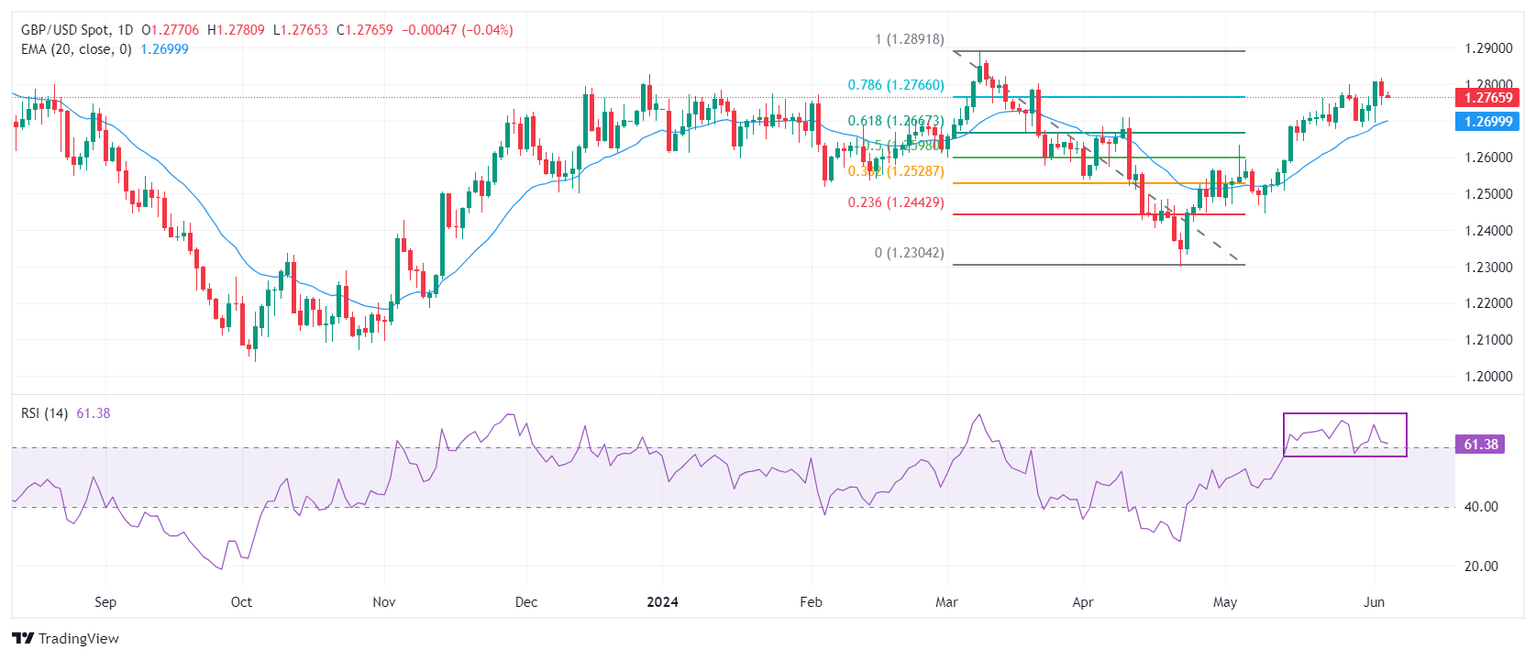 - The Pound Sterling falls from 1.2800 against the US Dollar after strong US ISM Services PMI data. The GBP/USD pair falls on backfoot as the US Dollar recovers further. However, the near-term outlook remains uncertain as this week, the major event will be the Nonfarm Payrolls (NFP) data for May, which will be published on Friday. The labor market data will provide fresh cues about the interest rate outlook.