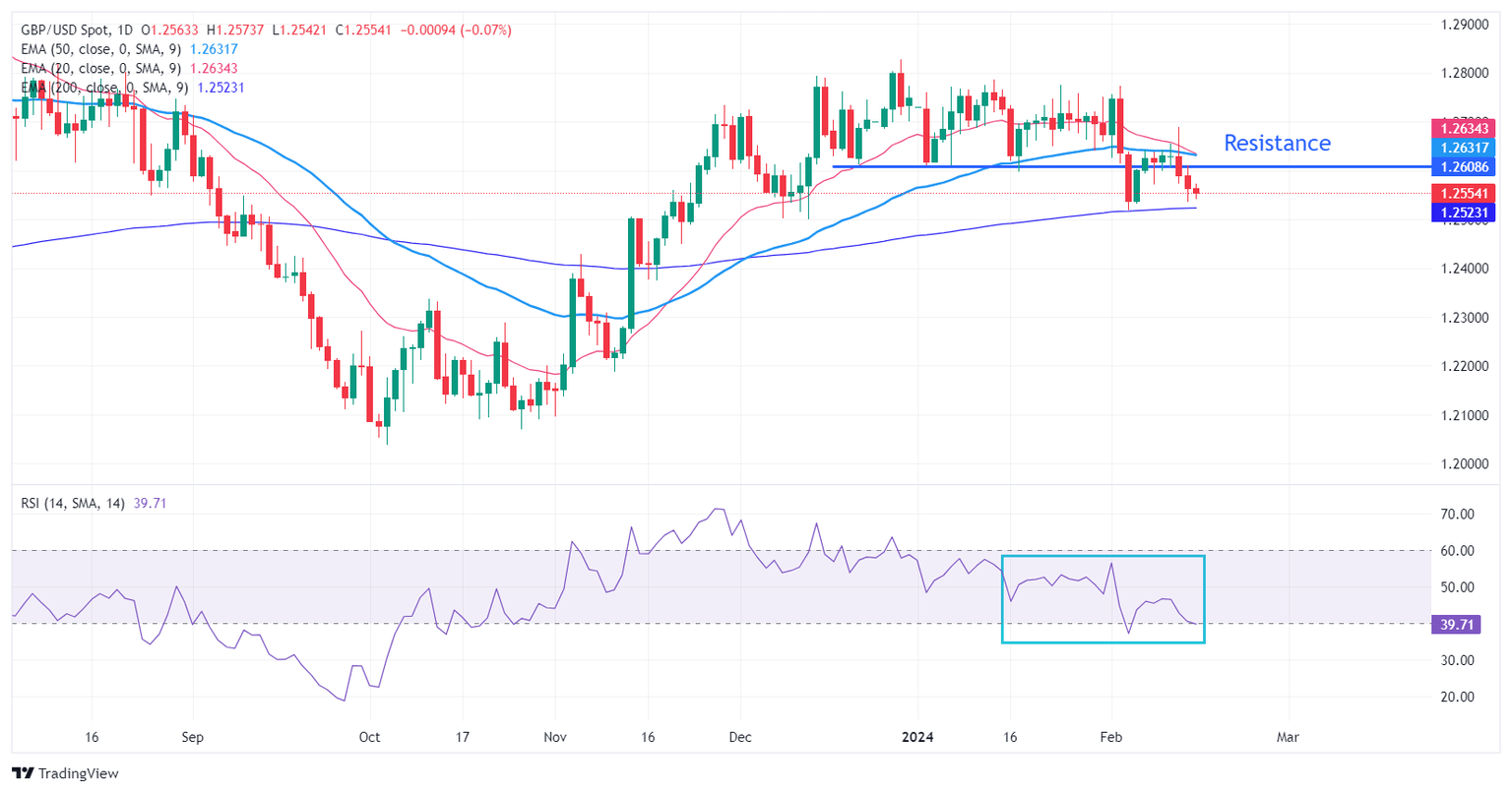 Pound Sterling rebounds to day's high near 1.2570 against the US Dollar, however, the broader appeal is still bearish. The GBP/USD pair is expected to resume its downside journey toward the 200-day Exponential Moving Average (EMA), which trades around 1.2520. More downside seems likely as the 20 and 50-day EMAs are on the verge of delivering a bearish crossover.