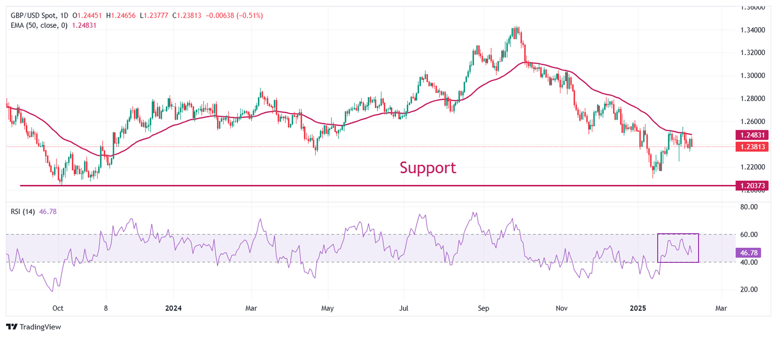 The Pound Sterling falls back below the key level of 1.2400 against the US Dollar in the North American session on Wednesday after rising to near 1.2450 earlier in the day. The outlook of the GBP/USD pair was already bearish as the 50-day Exponential Moving Average (EMA) around 1.2484 continues to be a major barrier for the Pound Sterling bulls.