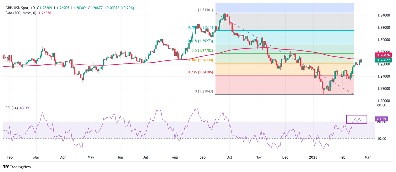 The Pound Sterling struggles to extend its upside to near the 200-day Exponential Moving Average (EMA), which stands around 1.2680, against the US Dollar in Monday’s North American session. The GBP/USD pair strengthened after breaking above the 38.2% Fibonacci retracement from the end-September high to the mid-January low downtrend around 1.2620.