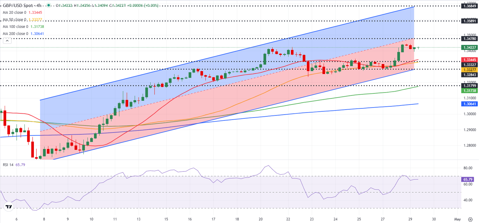 GBP/USD holds comfortably above the 20-period and the 50-period Simple Moving Averages (SMA) on the 4-hour chart and the Relative Strength Index (RSI) indicator stays above 60, reflecting a bullish bias. Read more...