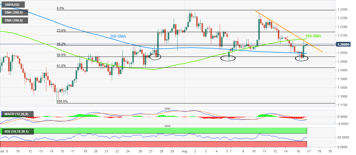 GBP/USD picks up bids to extend the previous day’s recovery to 1.2100 during Wednesday’s Asian session. In doing so, the Cable pair approaches a one-week-old resistance line while also portraying the third bounce off the 50% Fibonacci retracement level of July-August advances.