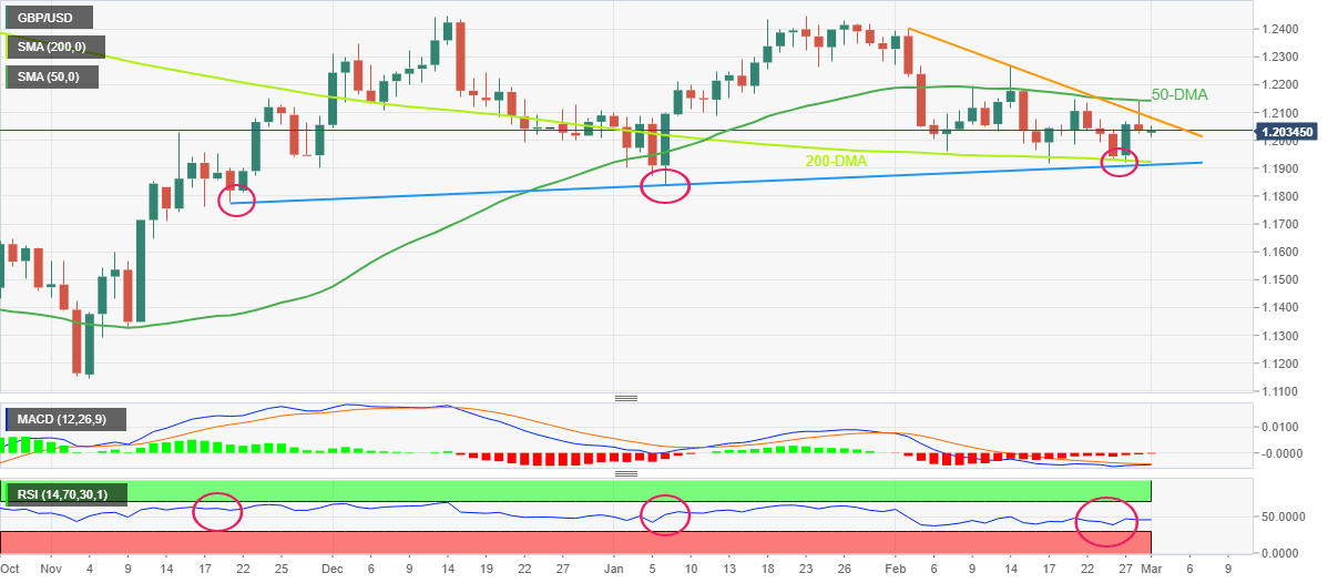 GBP/USD picks up bids to reverse the previous day’s pullback from the 50-DMA, around 1.2035 during the initial hours of Wednesday’s Asian session. The Cable pair rose to the highest levels in a week earlier on Tuesday before reversing from 1.2143 as optimism surrounding the Brexit deal and the pair’s strength from softer US data faded as the key March month begins.