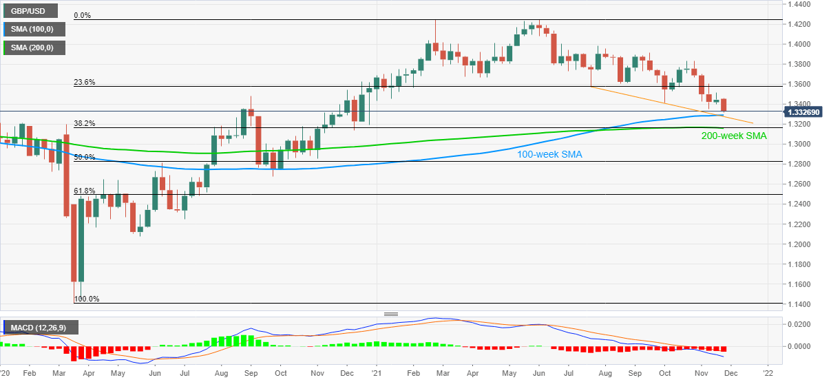 GBP/USD grinds lower around the yearly bottom surrounding 1.3320 amid the initial Asian session on Thursday, after declining for consecutive four days. Given the cable pair’s failures to rebound following the downside break of the September 2020 high, coupled with the bearish MACD signals, sellers are likely to keep the reins.