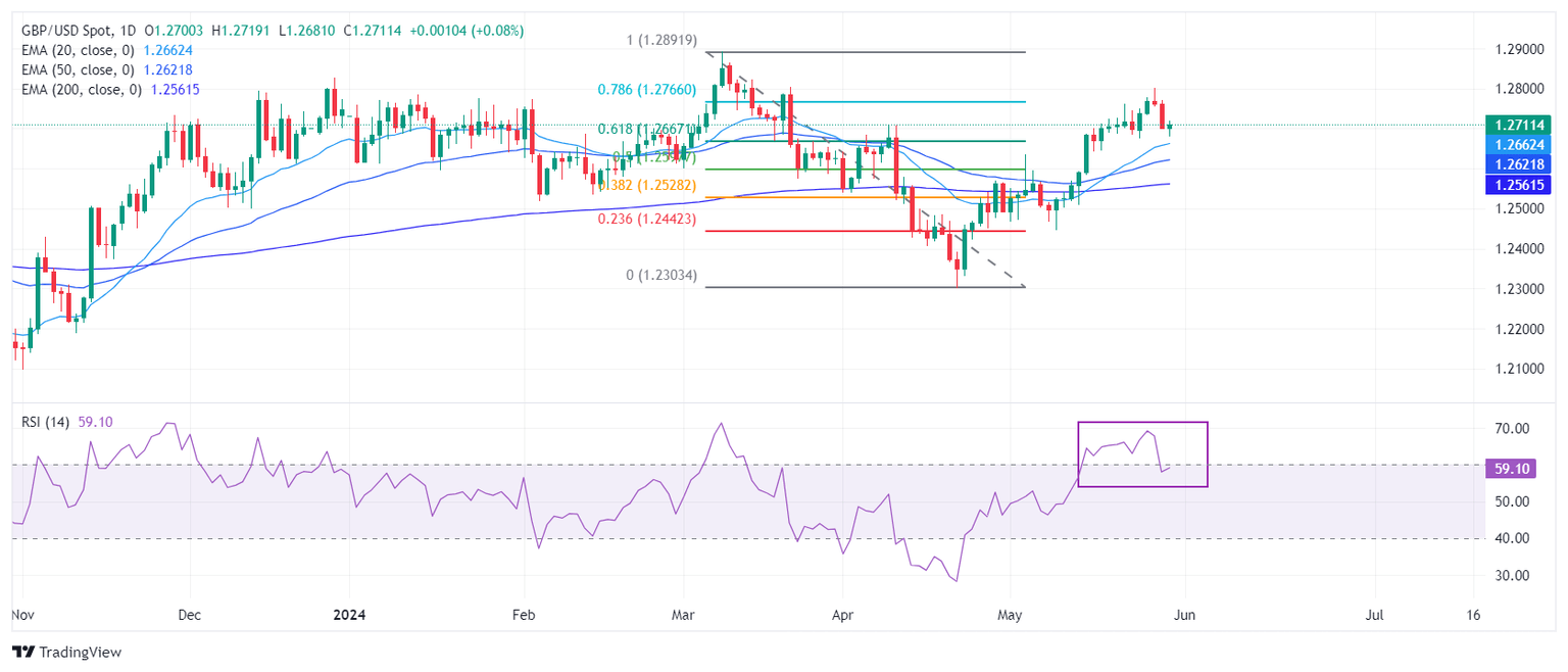 The Pound Sterling finds temporary support slightly below 1.2700 in Thursday’s European session after a sharp sell-off on Wednesday. The near-term outlook of the GBP/USD pair is still upbeat as it holds the 61.8% Fibonacci retracement support (plotted from the March 8 high of 1.2900 to the April 22 low at 1.2300) at 1.2670. The Cable is expected to remain bullish as all short-to-long-term Exponential Moving Averages (EMAs) are sloping higher, suggesting a strong uptrend.