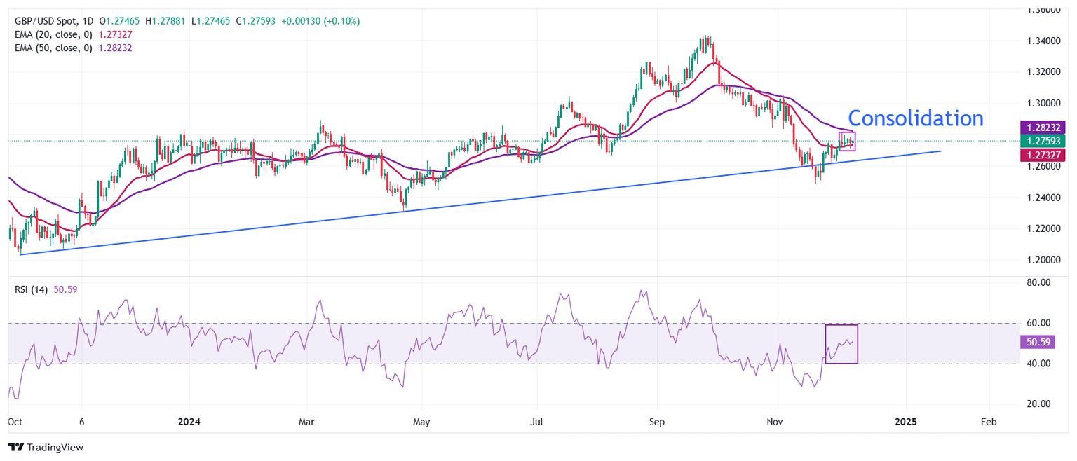 The Pound Sterling consolidates in a tight range around 1.2750 against the US Dollar for almost a week. The GBP/USD pair holds slightly above the 20-day Exponential Moving Average (EMA) around 1.2720.