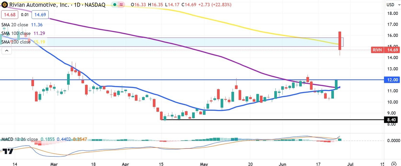 Rivian stock hit a daily high of $16.35, far above the Tuesday close at $11.96. The stock closed the session at $14.74, up 23.2%. RIVN stock rose in the late afternoon after reaching a daily low of $14.17.