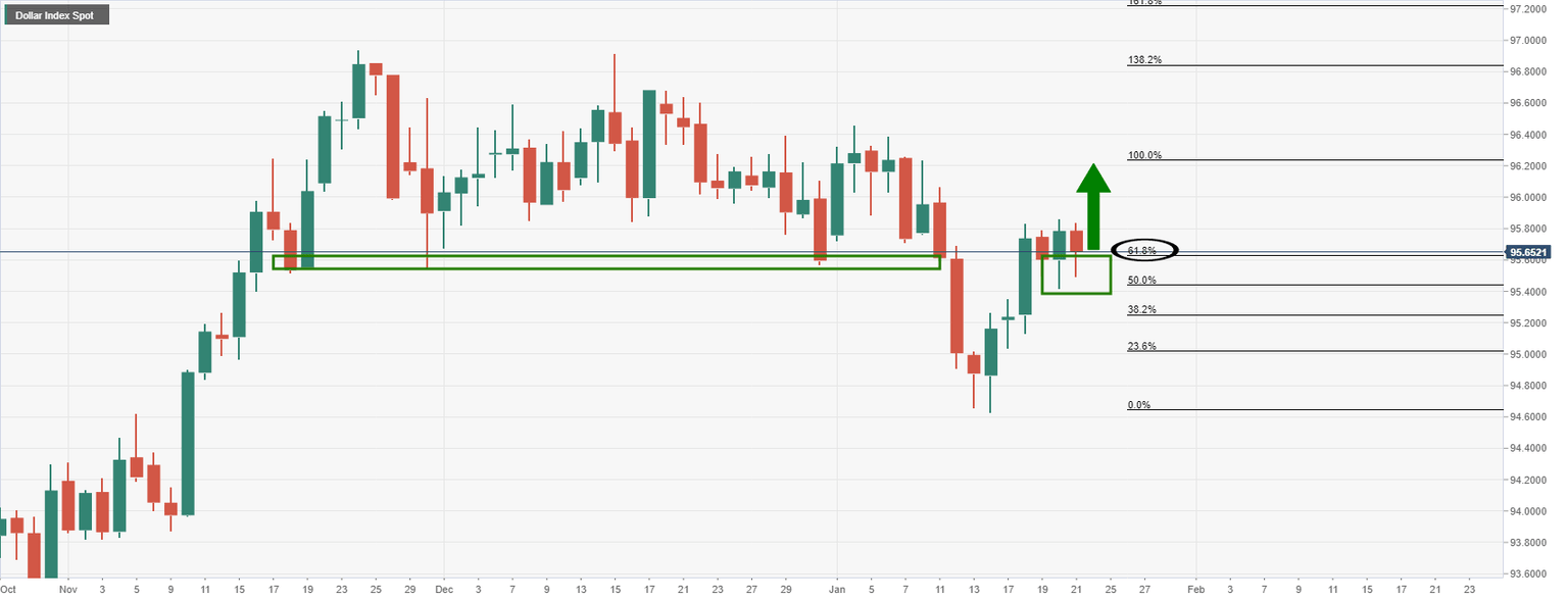 As per the DXY index, which measures the US dollar vs a basket of currencies, the greenback declined on Friday, along with US Treasury yields. Despite the risk-off price action displayed in the US stock market and concerns over Russia, the US dollar was pressured as investors looked through the headlines and instead towards this week's Federal Reserve meeting for more clarity on the outlook for rate hikes. However, a close eye will be paid to this type of escalation for today's open and the support could be expected to hold around the 61.8% Fibonacci level if safe haven flows dominate.