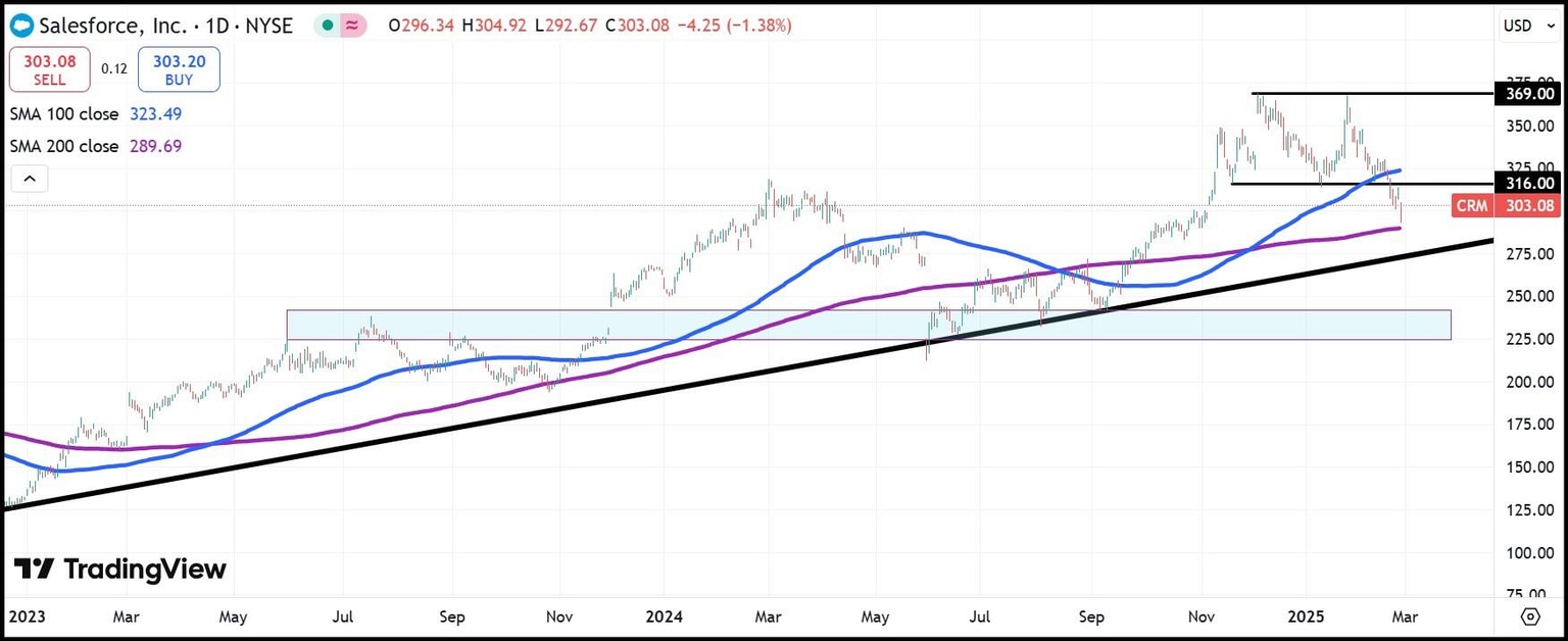 As it happens, the daily chart below shows that CRM stock is already well beyond the safety of the 100-day Simple Moving Average (SMA). The 200-day SMA may be the next rest stop near $290.