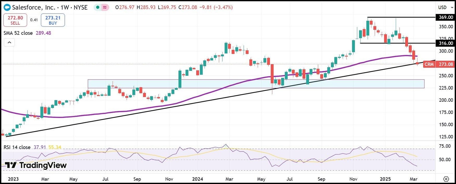 Salesforce sinks below long-term support as Dow Jones index loses 41,000
