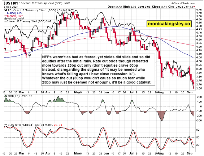 It wasn‘t the job market data that brought the stock market down after the swing higher, it was about acceleration of selling into (receding bout of) strength following the 50bp cut statement by Waller before EST lunch time. Remember my extensive analysis a week ago where I discussed hard landing as an underappreciated risk to stock market upswing – the data this week weren‘t stellar.