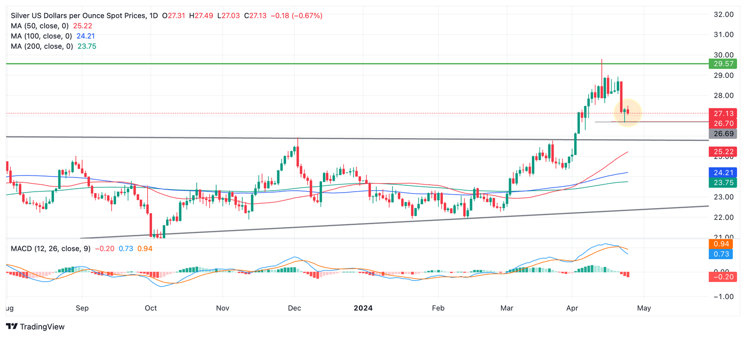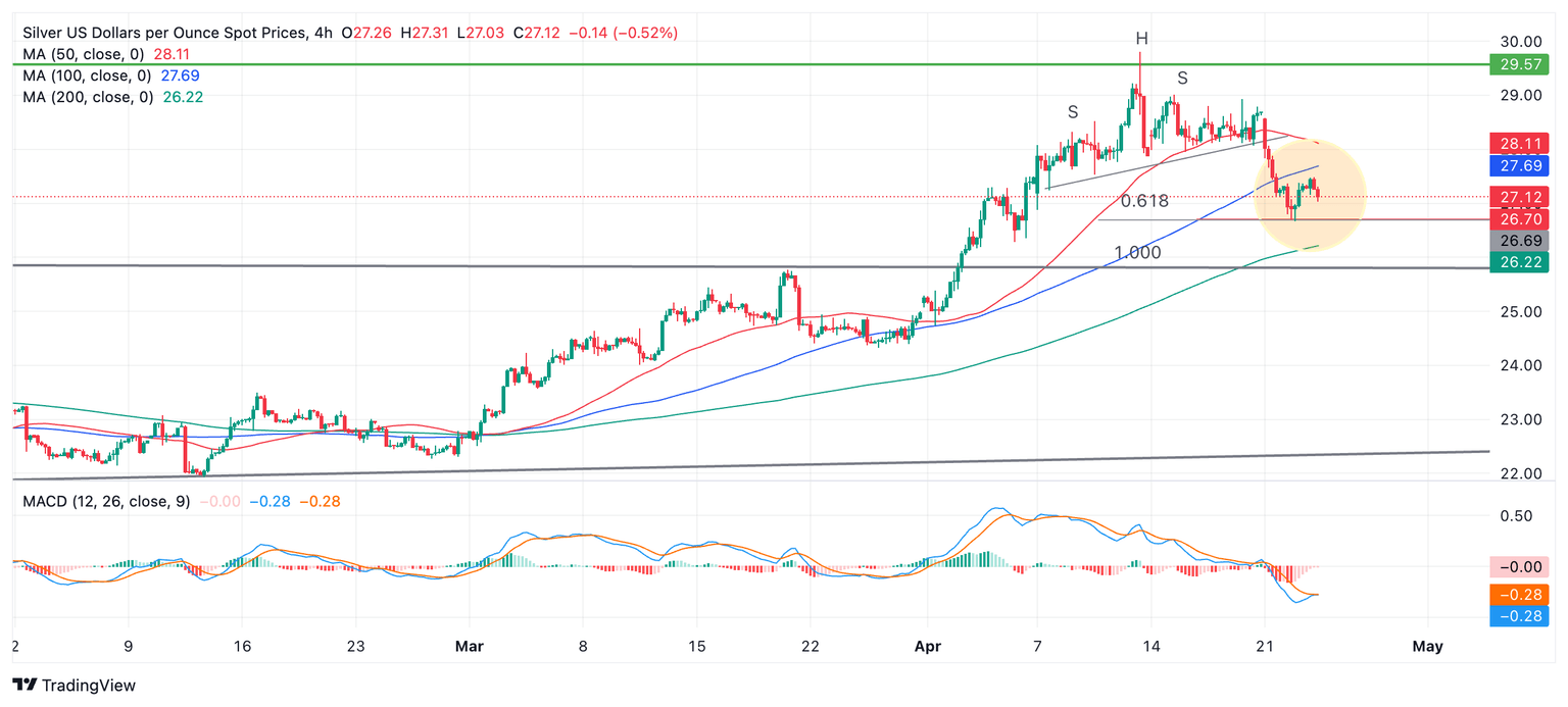- Silver price finds support at $26.70 but remains at risk of further weakness.