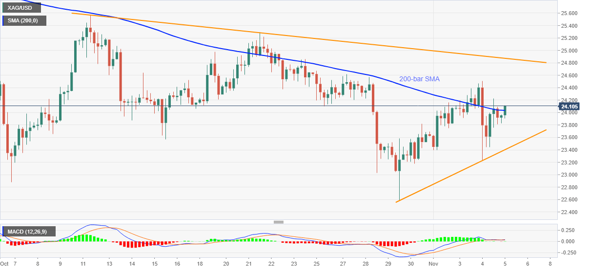 Silver picks up the bids near $24.05, up 0.64% intraday, during Thursday’s Asian session. In doing so, the white metal confronts 200-bar SMA after bouncing off $23.22 amid mildly bullish MACD signals.