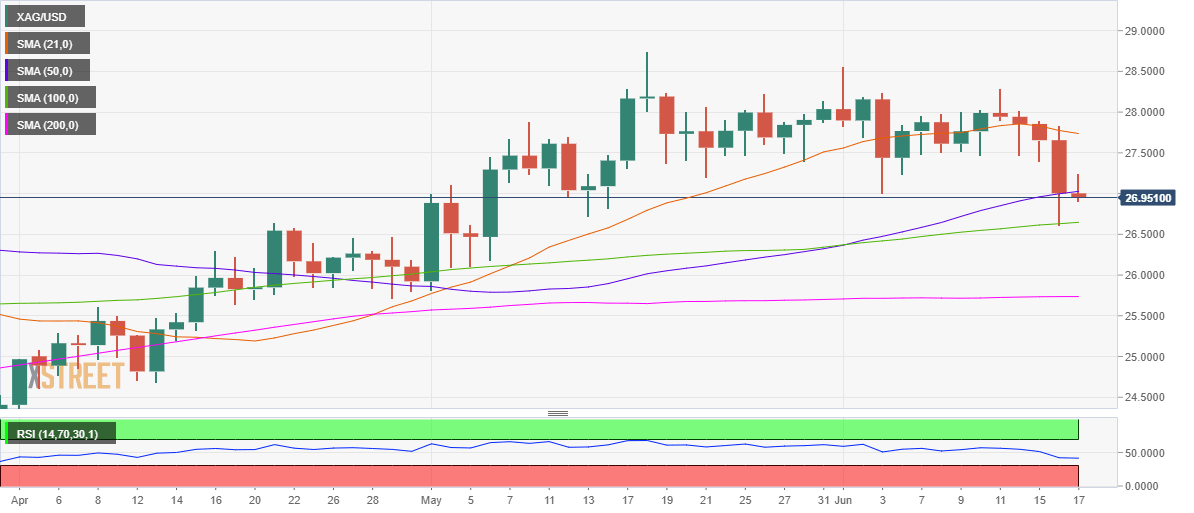 Silver price (XAG/USD) tumbled in tandem with gold price on Wednesday, as the US Federal Reserve (Fed) surprised markets with hawkish signals, suggesting sooner-than-expected rate hikes and tapering prospects.