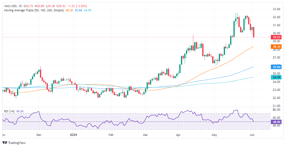 Silver prices sank sharply on Tuesday amid falling US Treasury bond yields and a firm US dollar. The grey metal dropped more than 4% at the time of writing and trades at $29.48 after the XAG/USD hit a daily high of $30.88.