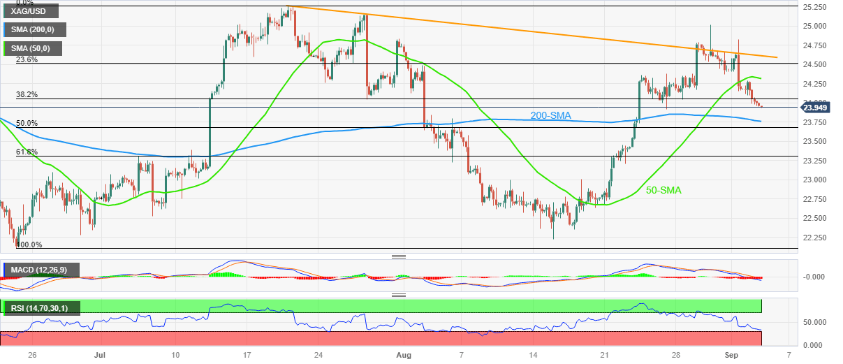 In a case where the XAG/USD remains bearish past $23.75, the 61.8% Fibonacci retracement of June-July upside, near $23.30, will act as the final defense of the buyers.