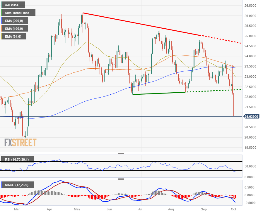 - XAG/USD continues its downside tumble on Monday, shedding value and slumping back into $21.00.