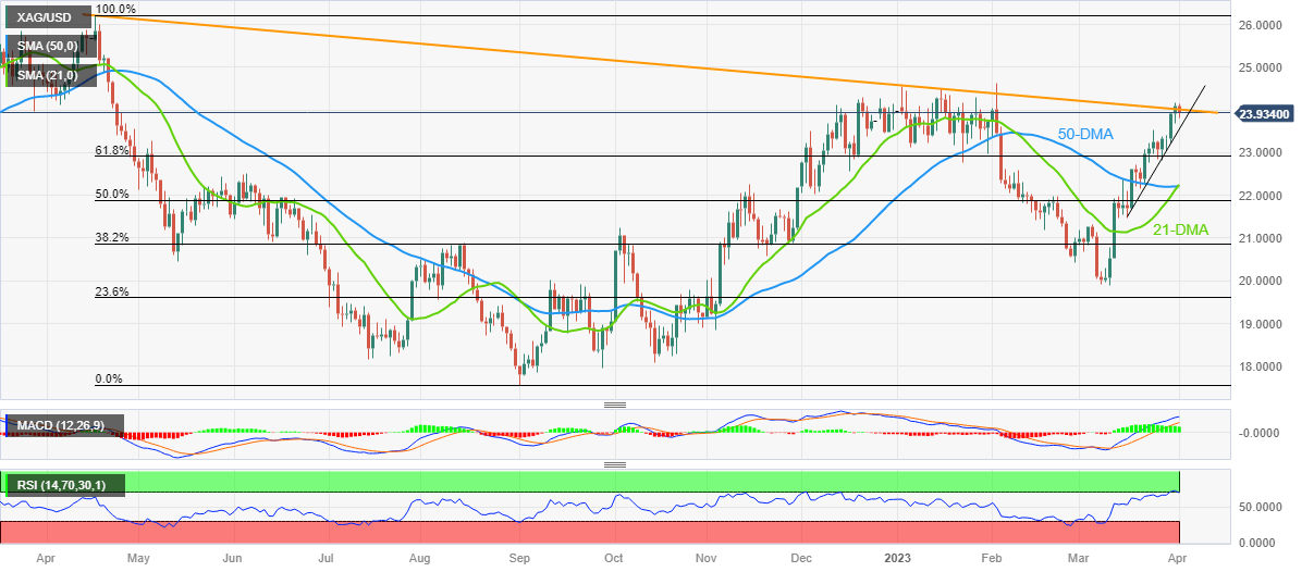 Silver price (XAG/USD) drops to $23.90 as it snaps a three-week uptrend during early Monday. In doing so, the bright metal reverses from a downward-sloping resistance line from April 2022. Adding strength to the XAG/USD pullback is the overbought RSI (14) line.