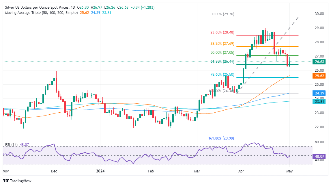 The grey metal dipped below the 61.8% Fibonacci retracement at $26.41, hitting a two-week low of $26.27 before resuming its uptrend. Although Silver reached a daily high of $26.96, buyers lacked the strength to break above the $27.00 figure, which paved the way to retreat to current price levels.