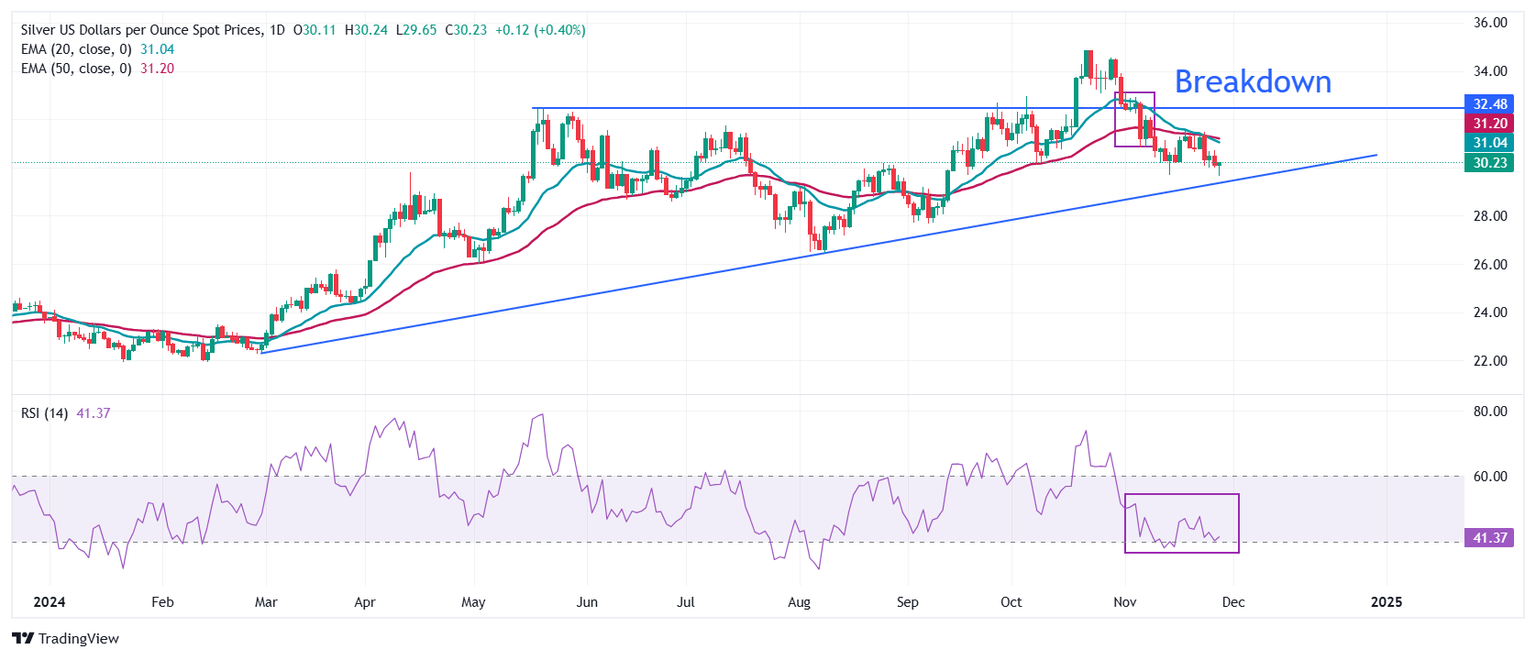 Silver price rebounds strongly after sliding to near the upward-sloping trendline around $29.50, which is plotted from the February 29 low of $22.30 on a daily timeframe. Still, the outlook of the Silver price is bearish as a bear cross, represented by 20 and 50-day Exponential Moving Average (EMA) around $31.30, points to an escalation in the downside trend.