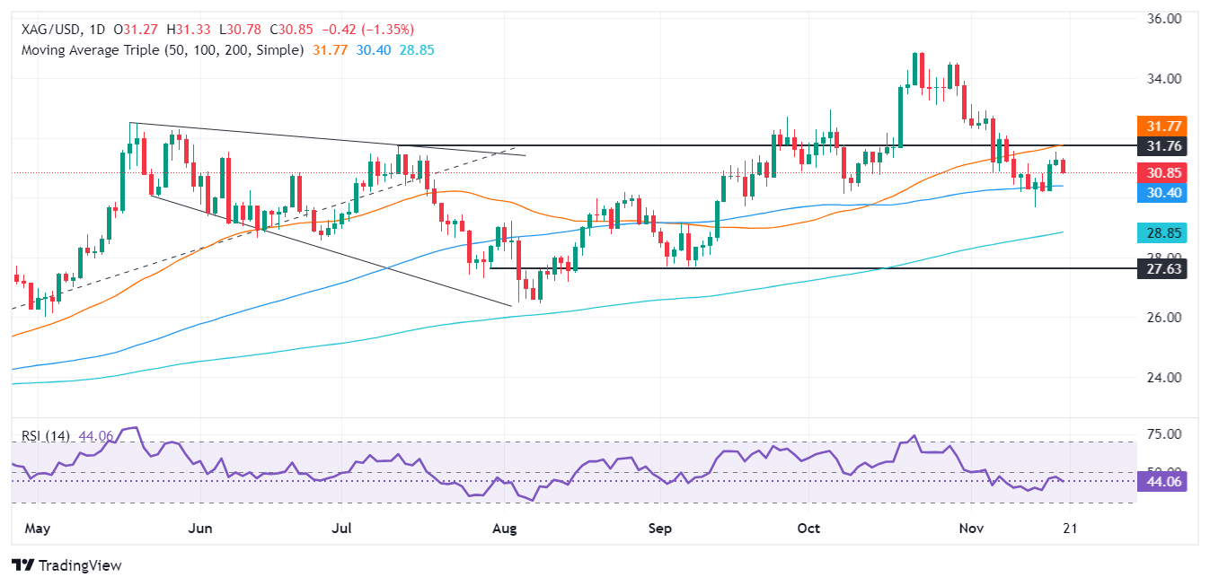 Once sellers push XAG/USD below the 100-day SMA, a bearish resumption will occur. If cleared, the next support would be $30.00 a troy ounce, followed by the November 14 swing low of $29.68 and the 200-day SMA at $28.88.