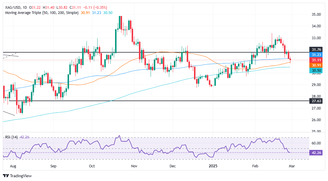 - XAG/USD slips to $31.13, with downside risks growing