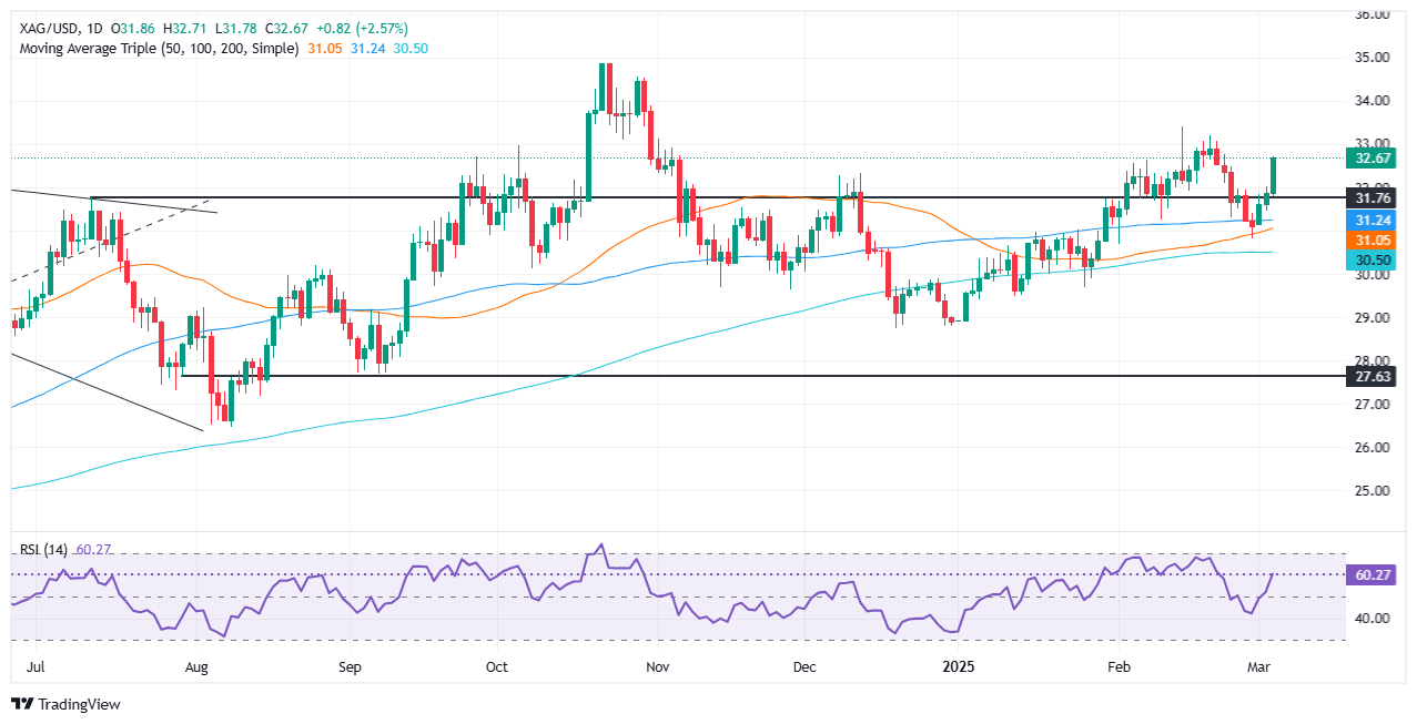 - Silver surges past $32.00, eyeing key resistance at $33.00 and $33.20.
