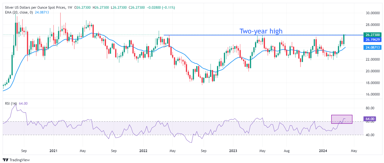 (This story was corrected on April 3 at 12:00 GMT to say that Silver price has marked a new two-year high at $26.55 instead of $26.30. It was also corrected to say that resistance at $26.22 was from April 18 2022 instead of April 22)