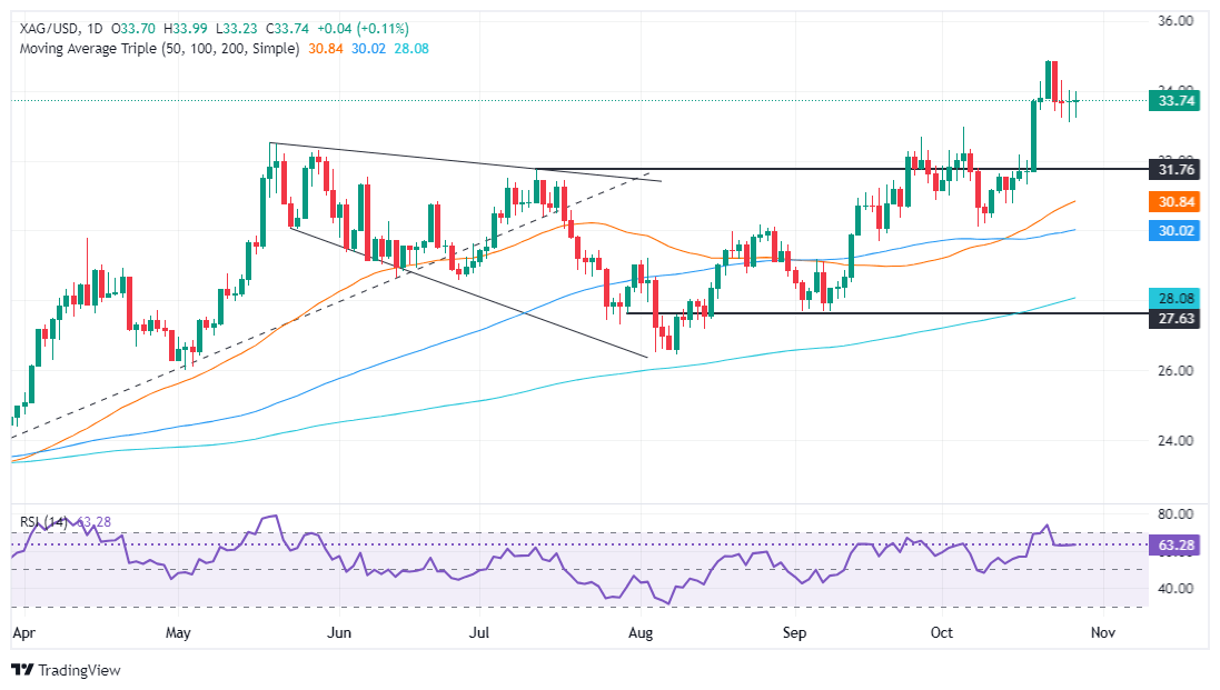 Conversely, if Silver price extended its losses below the October 25 swing low of $33.09, this could expose the October 17 pivot low at $31.32. On further weakness, XAG/USD's next support would be the 50-day Simple Moving Average (SMA) at $30.82.