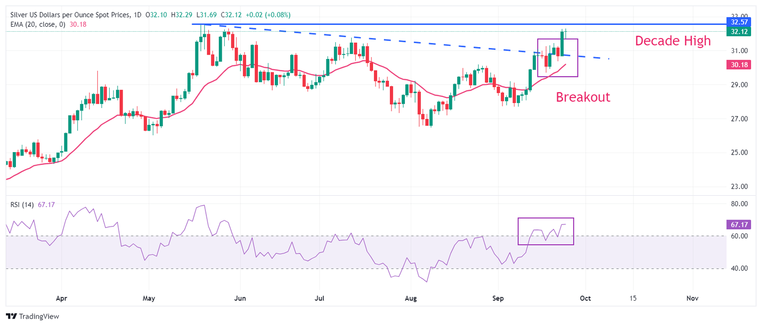 Silver price approaches the decade high of $32.50. The white metal strengthened after the breakout of the downward-sloping trendline from May 21 high of $32.50. Upward-sloping 20-day Exponential Moving Average (EMA) near $30.20 suggests that the near-term outlook of the Silver price is bullish.