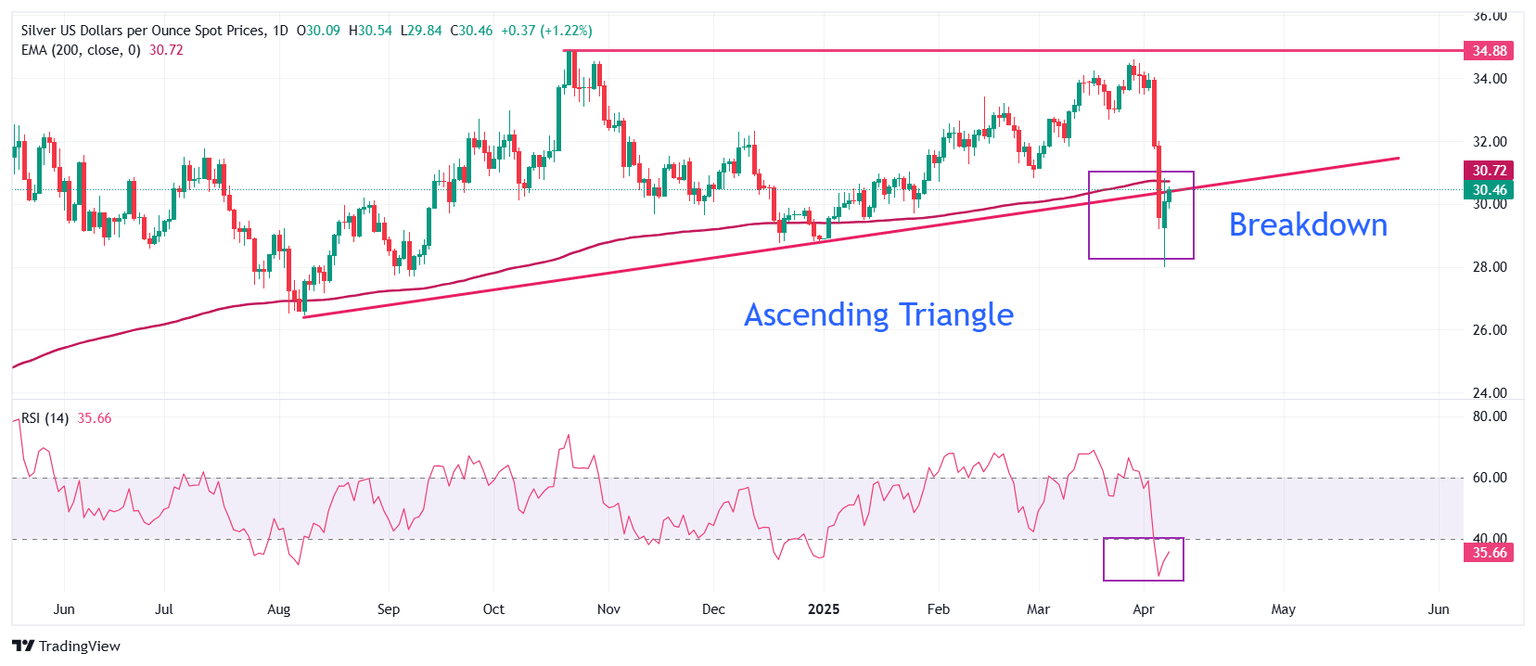 The overall trend of the Silver price is bearish as it trades below the 200-day Exponential Moving Average (EMA), which trades around $30.70.