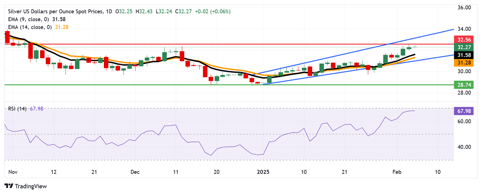- Silver price holds ground near its three-month high of $32.56, recorded on February 5.