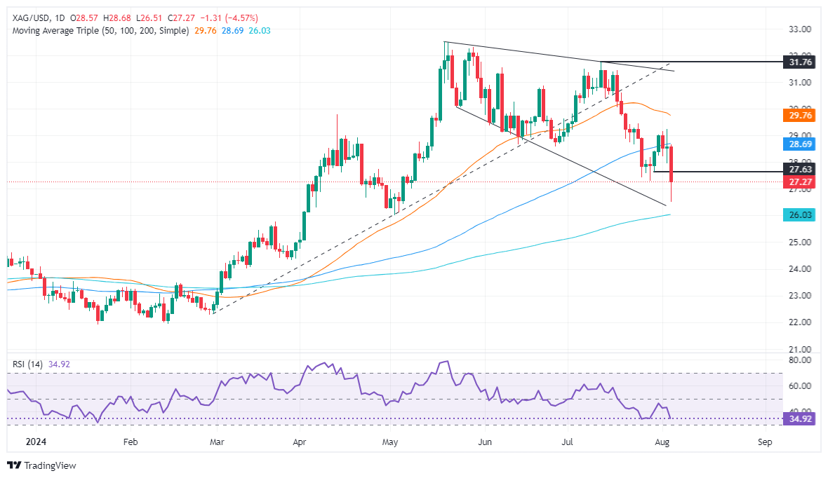 Silver's price extended its losses below the 100-day moving average (DMA) of $28.67 and is down over 4.50% as risk appetite deteriorated following weaker data from the United States (US). This reignited recession fears, as ISM Manufacturing PMI and Nonfarm Payrolls report disappointed investors, who flock to safe-haven assets, mostly US Treasuries. The XAG/USD trades at $27.23 after hitting a daily high of $28.67.
