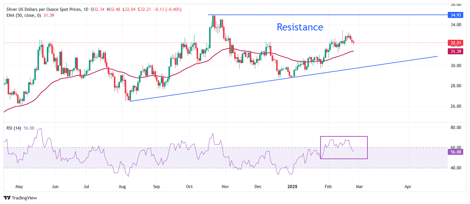 Silver price retraces after failing to extend its upside above the February 14 high of $33.40 on Thursday. The outlook of the white metal remains bullish as the 50-day Exponential Moving Average (EMA) has been sloping higher, which trades around $31.40.
