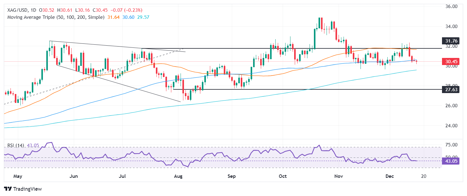Silver Price Forecast: XAG/USD slips below 100-day SMA, eyes $30.00