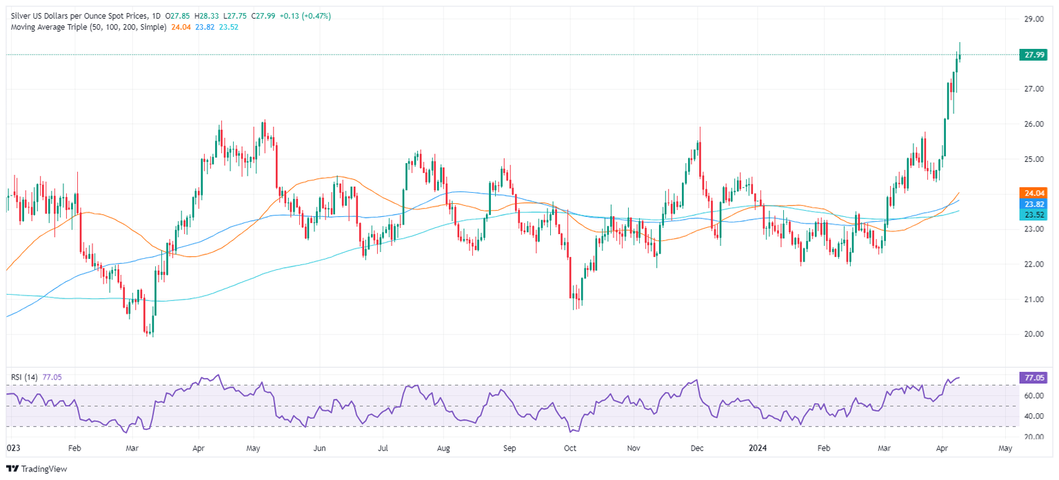 The daily chart suggests that XAG/USD might continue to rally past the $28.00 figure, though the Relative Strength Index (RSI), turning overbought, spurred a pullback. That could be seen as traders booking profits.