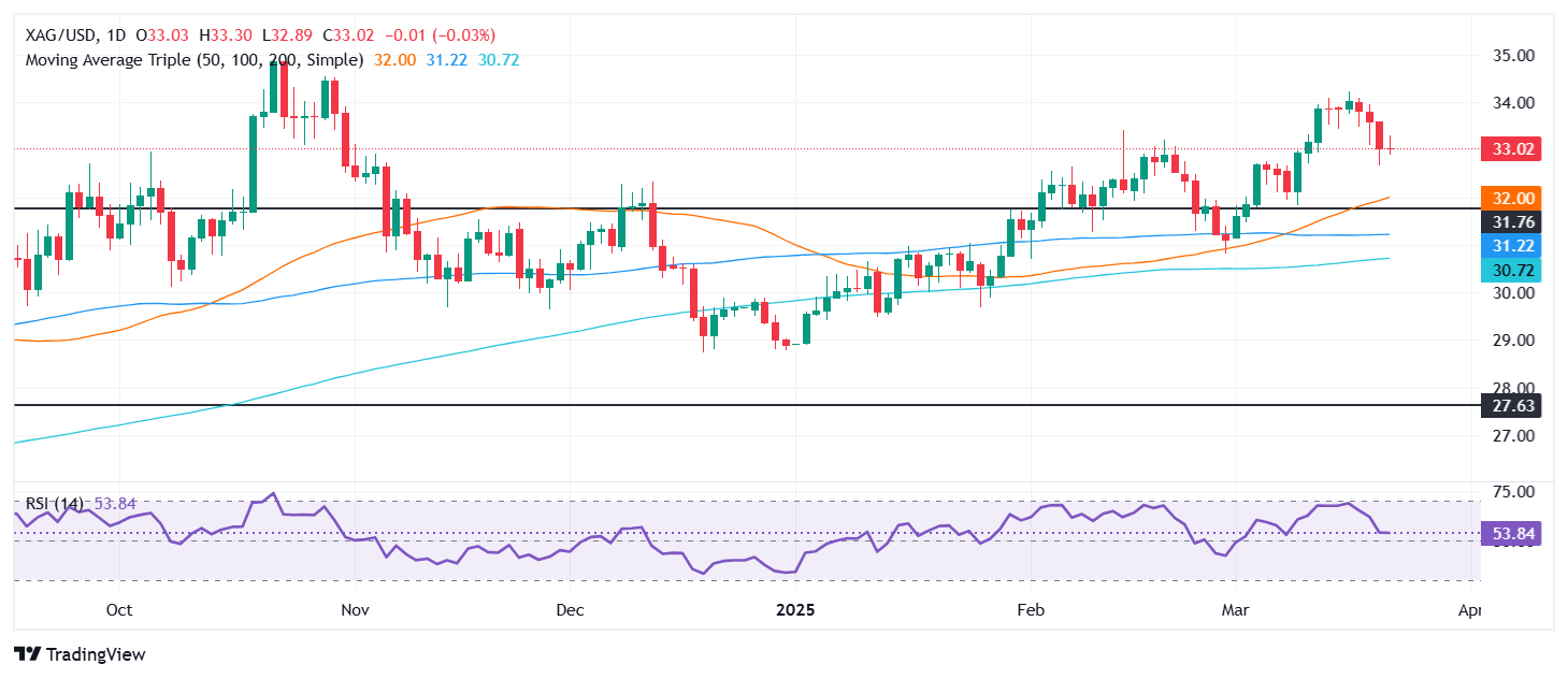 Conversely, if XAG/USD slips beneath $32.90, immediate support emerges at March 21 through at $32.66. Once hurdled, the next stop is the 50-day Simple Moving Average (SMA) at $32.04.