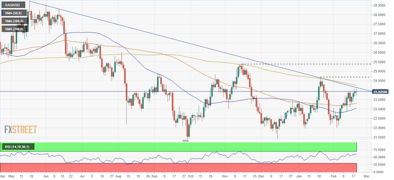 During the overnight session for North American traders, the white metal failed to gain acceptance above the $24.00 mark, protected above by a ten-month-old downslope trendline and the 200-day moving average (DMA) at $24.25. It is worth noting that based on the price action, the $0,15 mean reversion move could be attributed to profit-taking, as the non-yielding metal, as shown by the 1-hour chart, stalled at the 50-hour moving average (HMA) around $23.86.