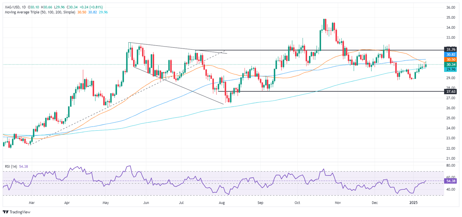 Silver continues to trend higher, advancing steadily above the $30.00 figure for the latest fhree trading days, boosted by buyers emerging at crucial support found at the 200-day Simple Moving Average (SMA) at $29.93. However, they are struggling with stir resistance at the 50-day SMA at $30.42, which has kept prices from reaching the 100-day SMA at $30.80.