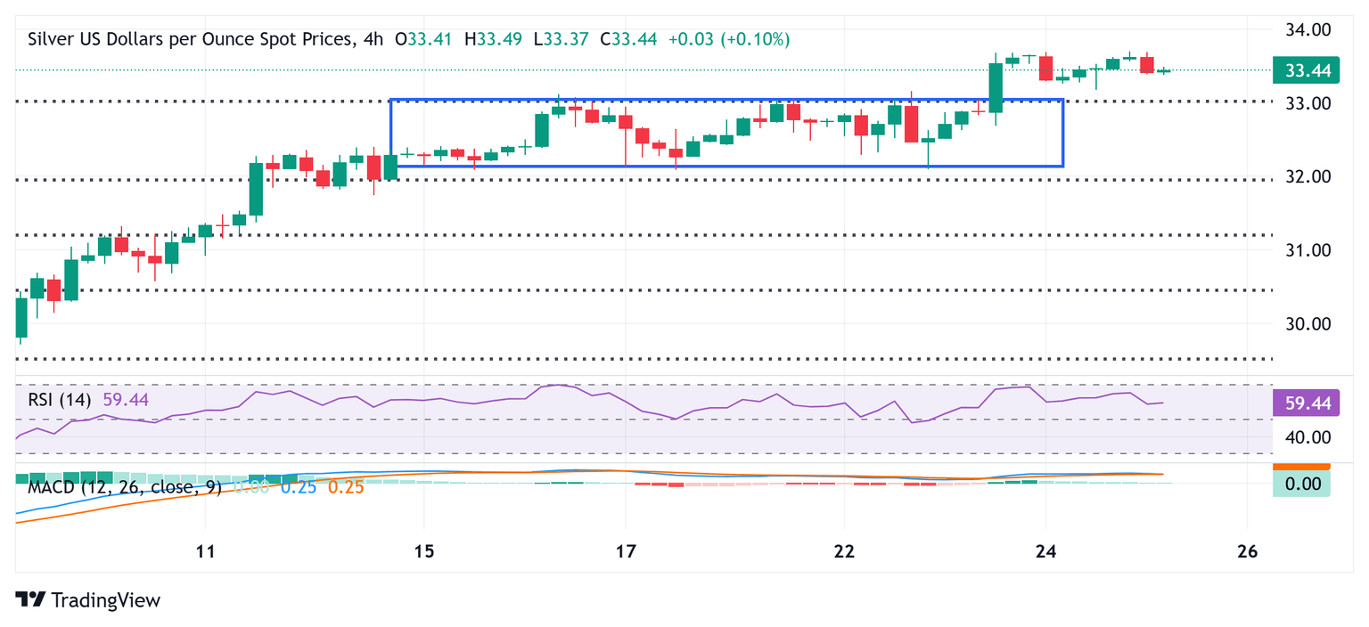 Silver (XAG/USD) edges lower after testing the three-week top during the Asian session on Friday and currently trades around the mid-$33.00s, down 0.30% for the day. The technical setup, however, warrants caution before positioning for any meaningful depreciating move.