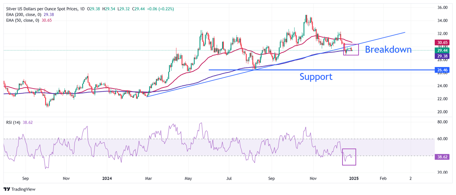 Silver price (XAG/USD) trades cautiously near Friday’s low around $29.50 in thin volume conditions before New Year on Monday. The white metal is broadly under pressure as the outlook of the US Dollar (USD) remains firm on expectations that a moderate policy-easing cycle by the Federal Reserve (Fed) in 2025 will keep US Treasury yields elevated.