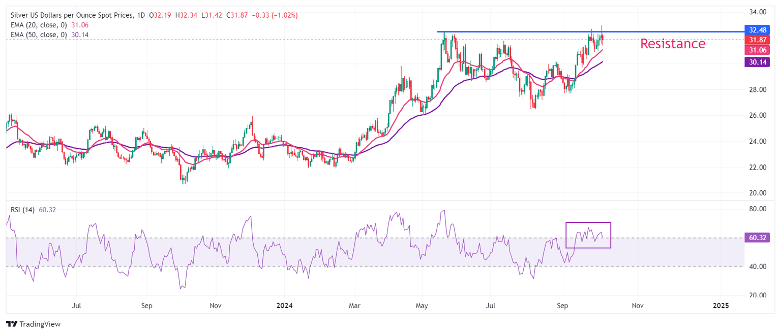 Silver price continues to face pressure near the horizontal resistance plotted from the May 20 high of $32.50 on a daily timeframe. The white metal strives for more upside as the outlook is upbeat due to upward-sloping 20 and 50-day Exponential Moving Averages (EMAs), which trade around $31.00 and $30.00, respectively.