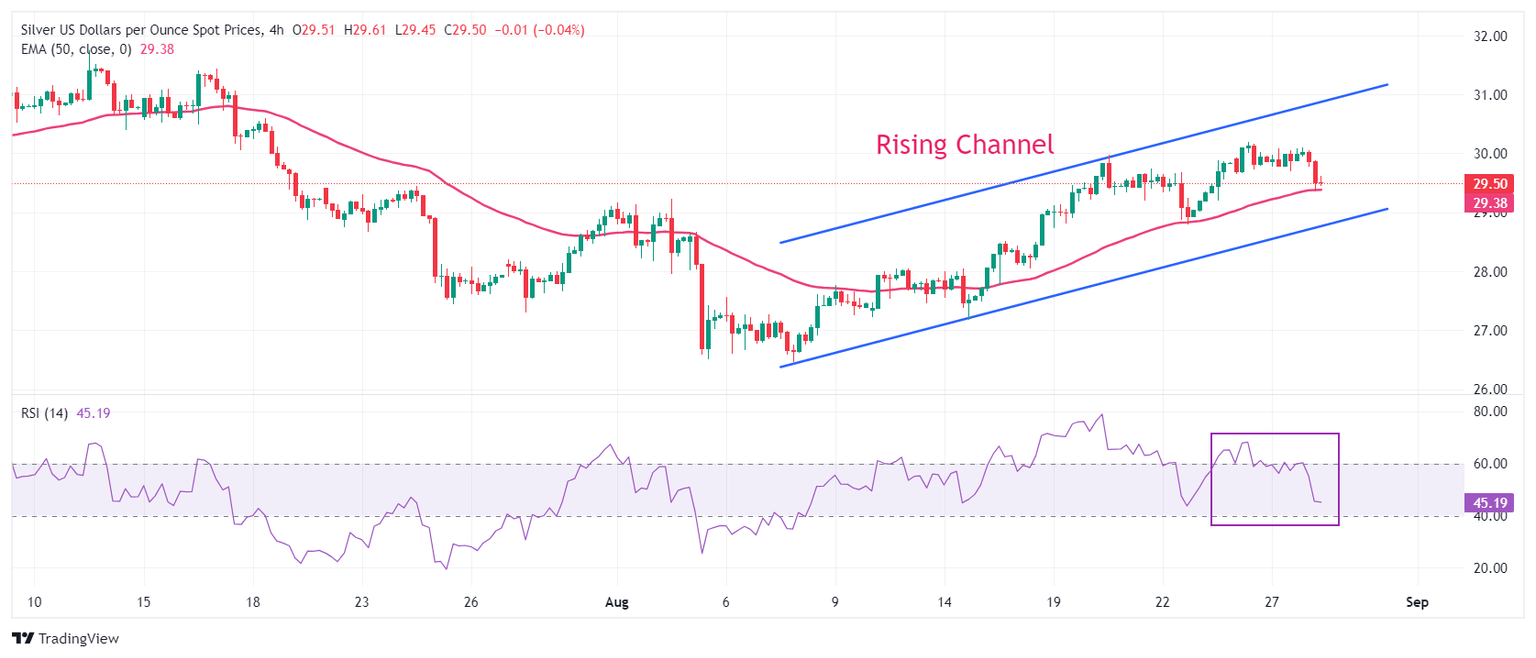 Silver price trades in a Rising Channel chart pattern on a four-hour timeframe in which each pullback is considered as a buying opportunity by market participants. The 50-period Exponential Moving Average (EMA) near $29.40 continues to provide support to the Silver price bulls.