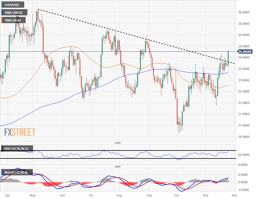 Friday's surge back over $24.20 sees XAG/USD making a break of a descending trendline from May's peaks above $26.00, and Silver is making a break away from the 200-day Simple Moving Average (SMA) near $23.25.
