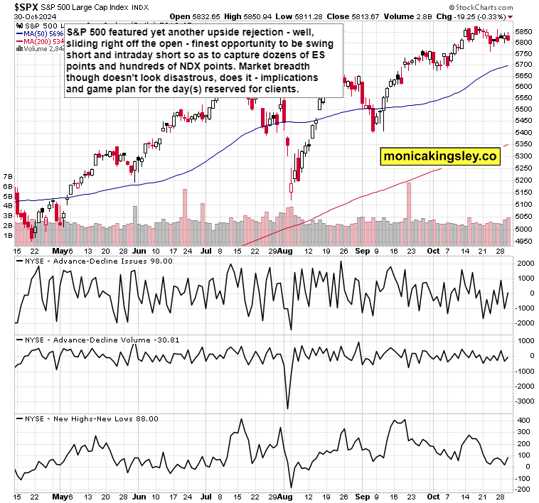 Correct bearish positioning brought immense gains for clients, both swing and intraday – over 300 NDX points and over 50 ES points gained. What‘s been different lately, is distinct selling into the closing bell, and selling of very decent earnings MSFT and META, which is what I warned about yesterday. Pre-elections positioning snapping back, such was the theme I chose to hammer yesterday – and you see in the below snapshot from our intraday channel as well that my commentary on individual megacaps performance highlights the shifting sentiment before the all-important next week. Today‘s data also point to no recession ahead, coming in decent.