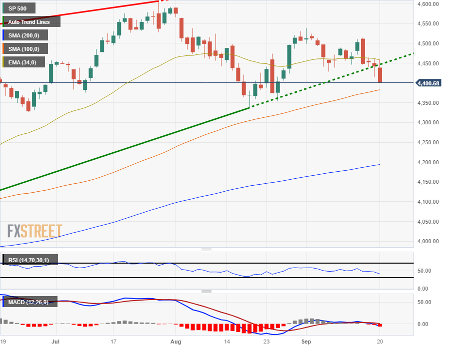 The S&P 500 spent much of the early part of Wednesday in the green, trading into $4,460.00 from the day's open near $4,440.00. However, the hawkish Fed outlook sent equities tumbling, sending the index down to close out the day at $4,400.