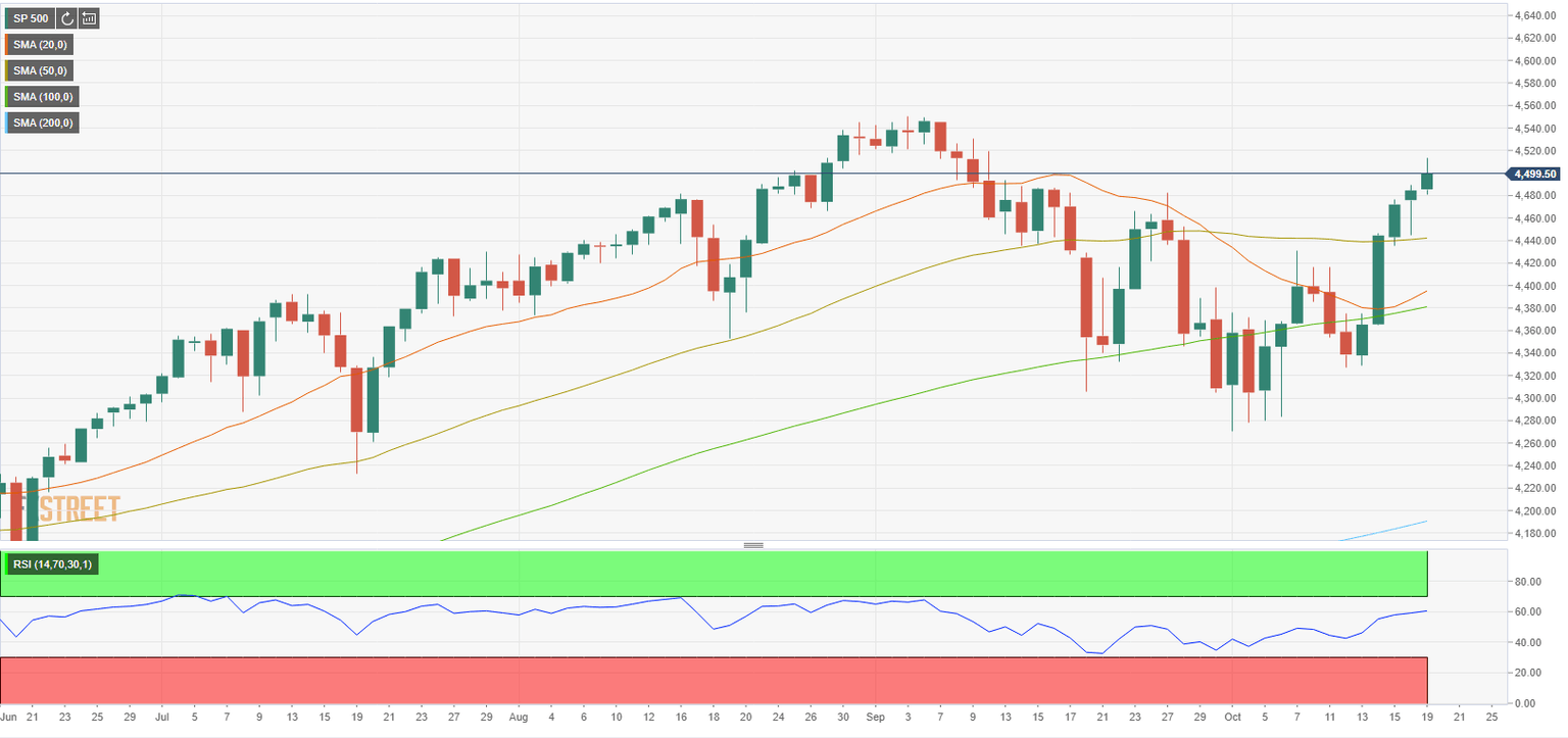 Major equity indexes in the US opened in the positive territory on Tuesday as the market mood remains upbeat ahead of key quarterly earnings figures. As of writing, the S&P 500 was up 0.3% on the day at 4,500, the Dow Jones Industrial Average was rising 0.2% at 35,310 and the Nasdaq Composite was gaining 0.4% at 15,079.