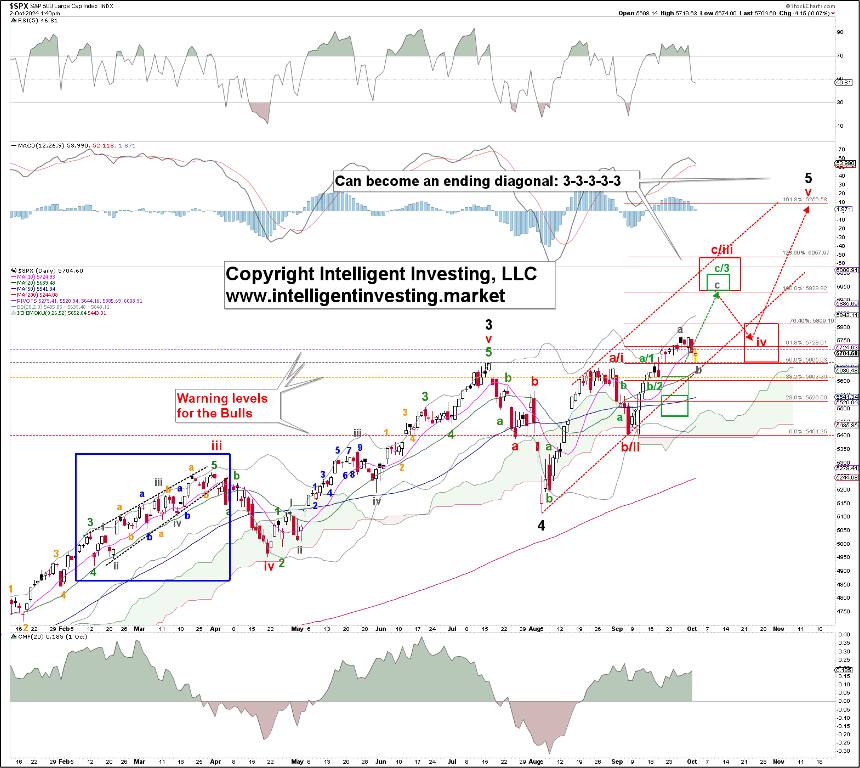 However, it requires a break below the September 6 low, with a severe warning below $5490, to tell us that will be the case. From there, the black W-5 can start. However, this remains our alternative view, “insurance policy,” as the index is still trending higher.