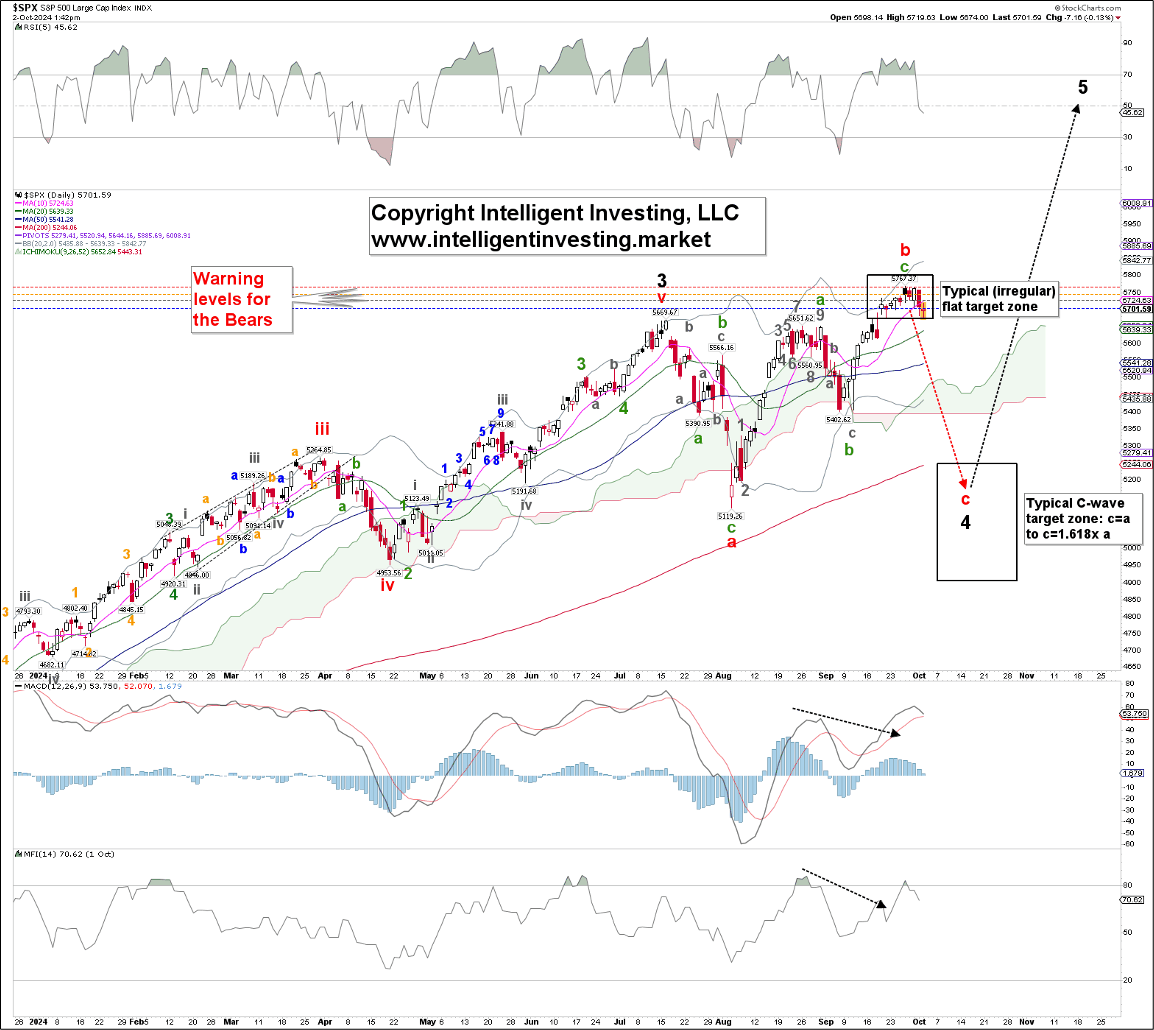 Our previous update showed that “the black W-4 [can] morph into a flat correction. A flat correction often has a=b=c; thus, the red W-c can drop back to the $5100 level.” We still cannot exclude this possibility since the index has reached the typical target zone for the B-wave of an (irregular) flat: b=a to b=1.236x a. Hence, a protracted 5-3-5, a-b-c pattern can have been completed last week’s high.