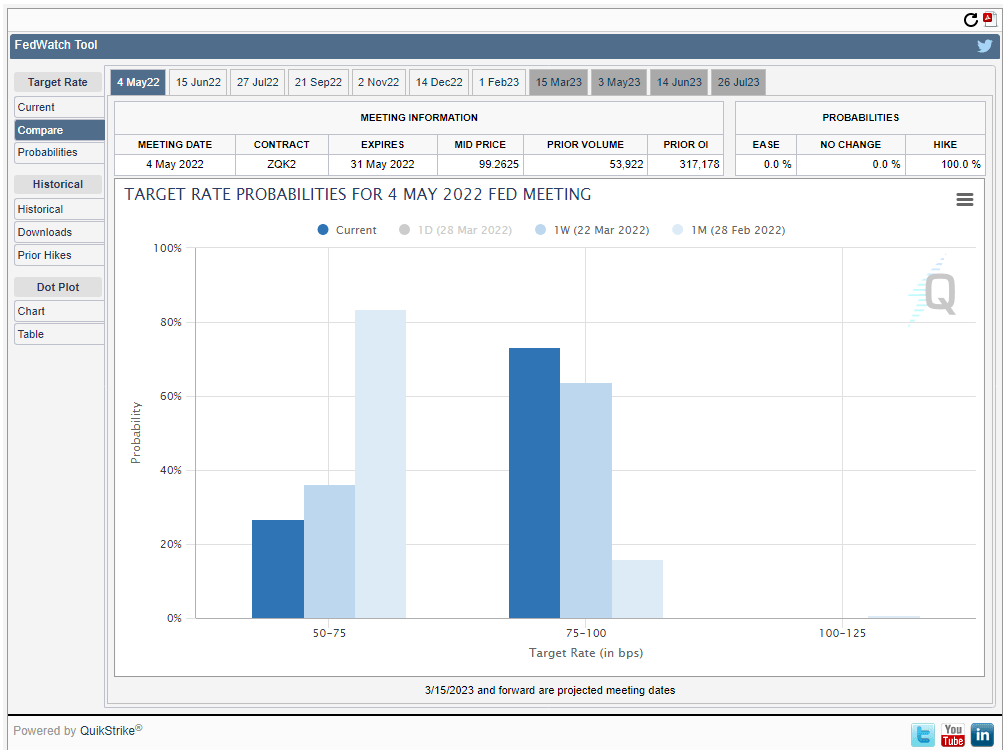 We take note of the increasingly hawkish predictions for the next Fed meeting in May. The Chicago Mercantile Exchange's (CME) Fed Watch tool is a benchmark for monitoring market probabilities of Fed interest rate decisions. Note below how the indicator is signaling a 73% chance of a 75-100 basis point rate at the next Fed meeting. For comparison, one month ago the probability for a 75-100 basis point base rate was a mere 15%. That implies a 50 basis point hike is a given and 75 basis points is on the table. Equity markets, especially high-growth stocks, will not react well if that plays out as predicted.